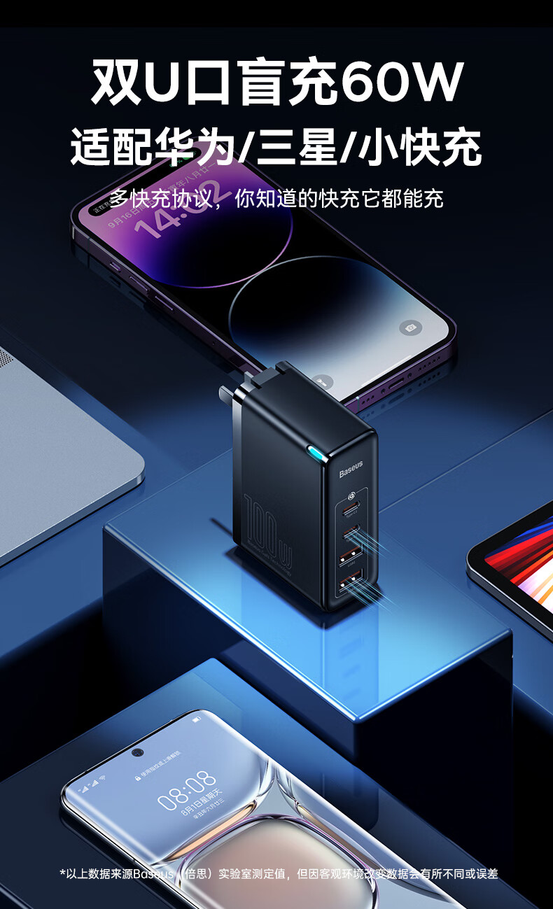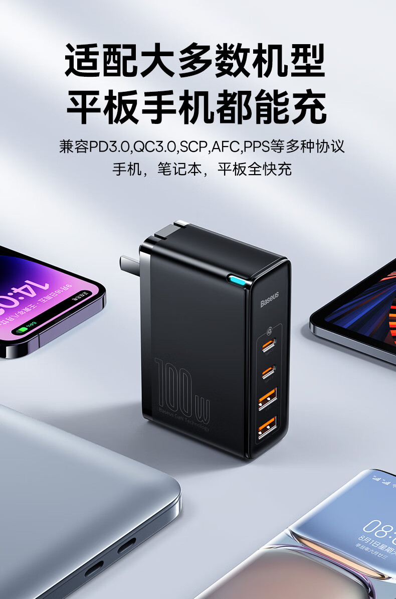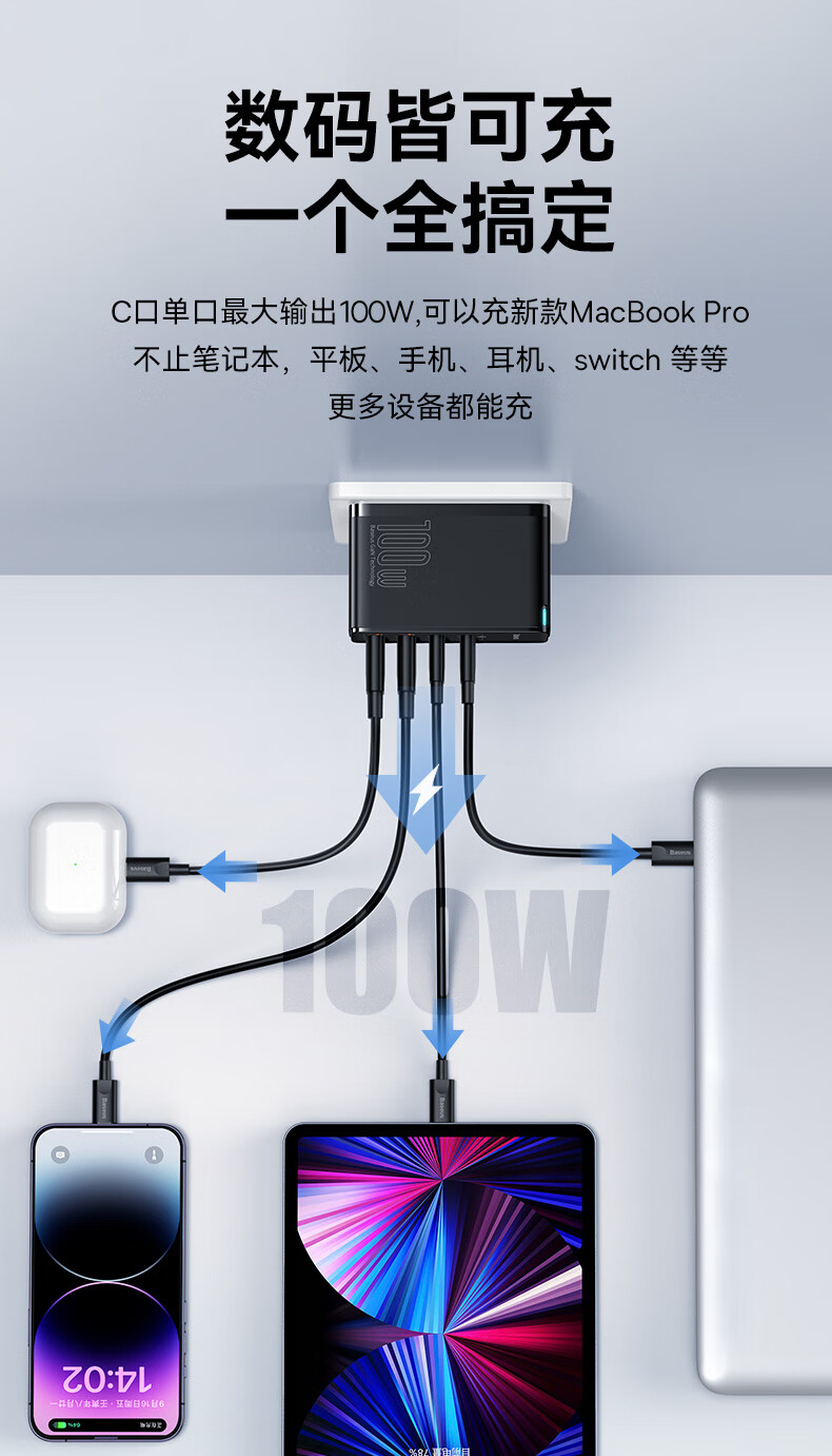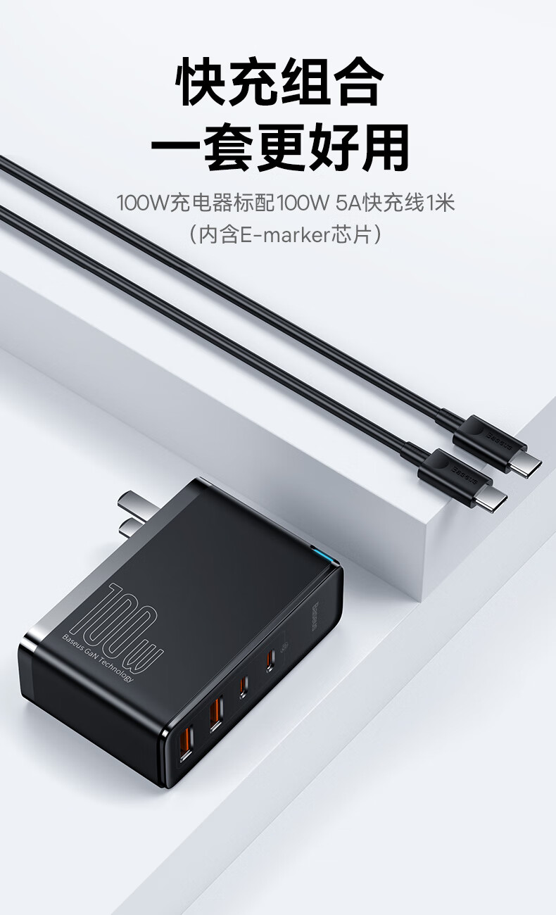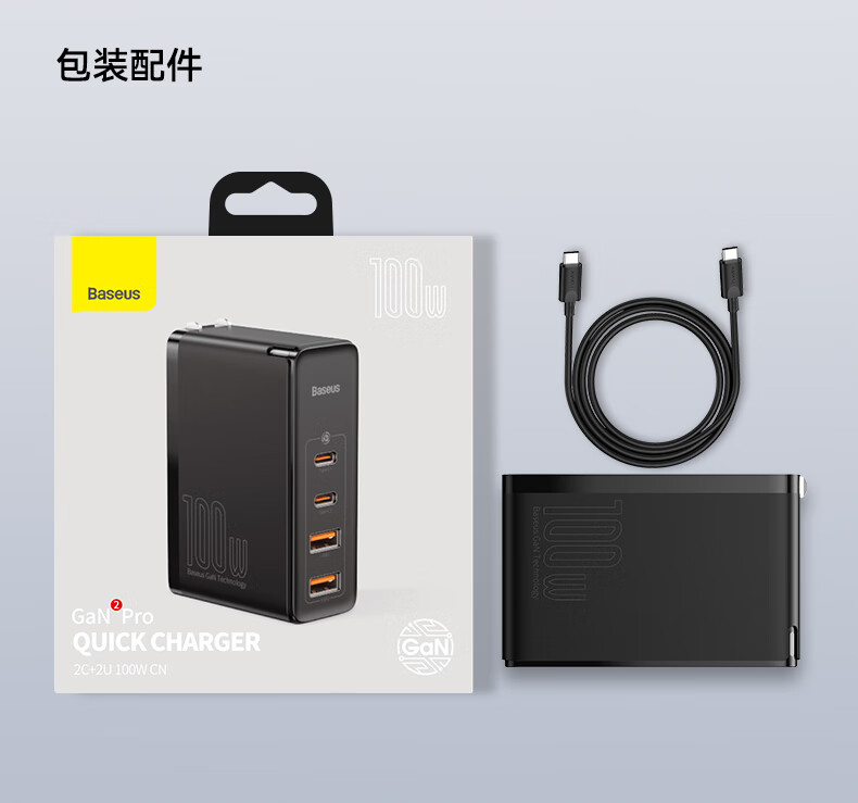 倍思 100W氮化镓充电器套装 兼容PD65W四口快充 适用苹果iPhone14/13华为手机Macbook联想笔记本电脑 CCGAN100UC黑 SKU:SXT206269