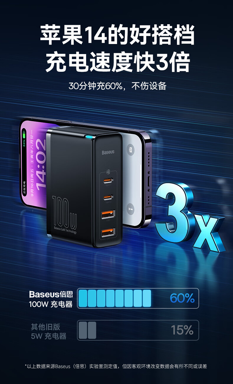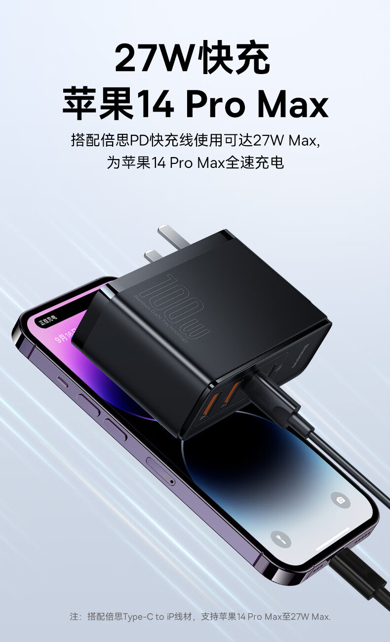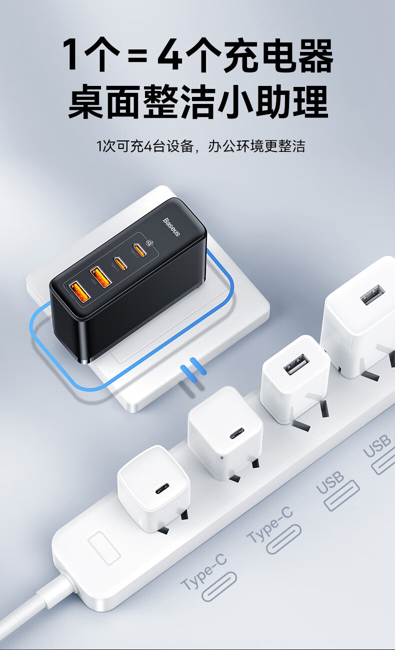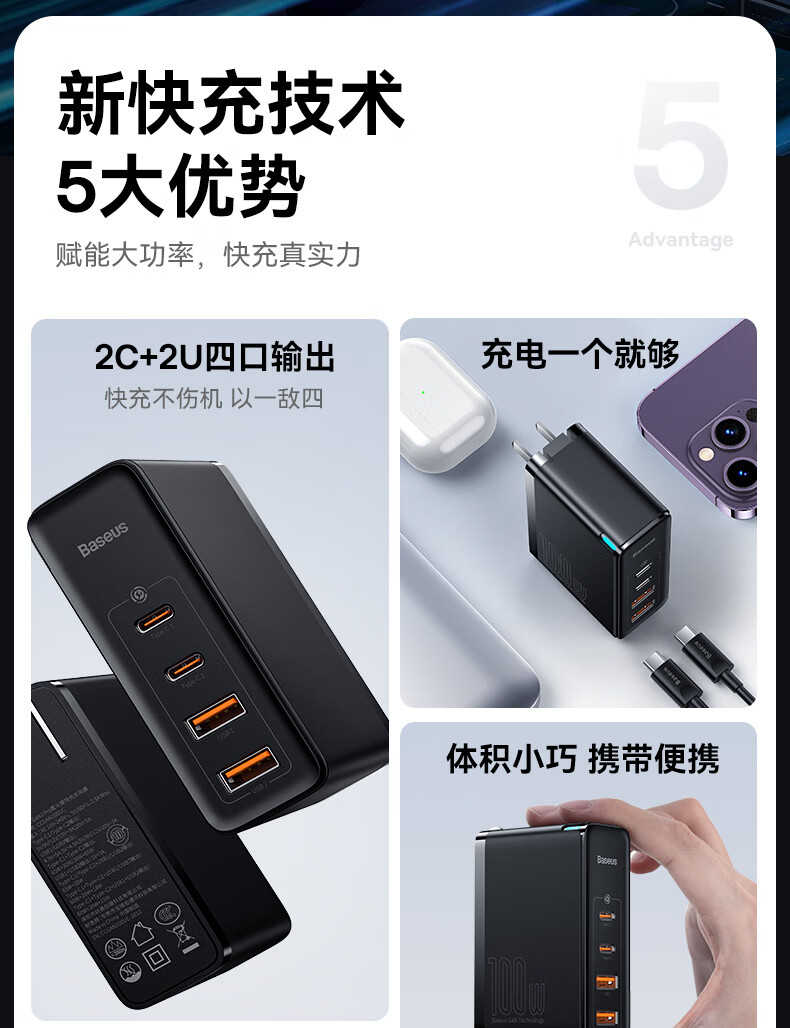 倍思 100W氮化镓充电器套装 兼容PD65W四口快充 适用苹果iPhone14/13华为手机Macbook联想笔记本电脑 CCGAN100UC黑 SKU:SXT206269