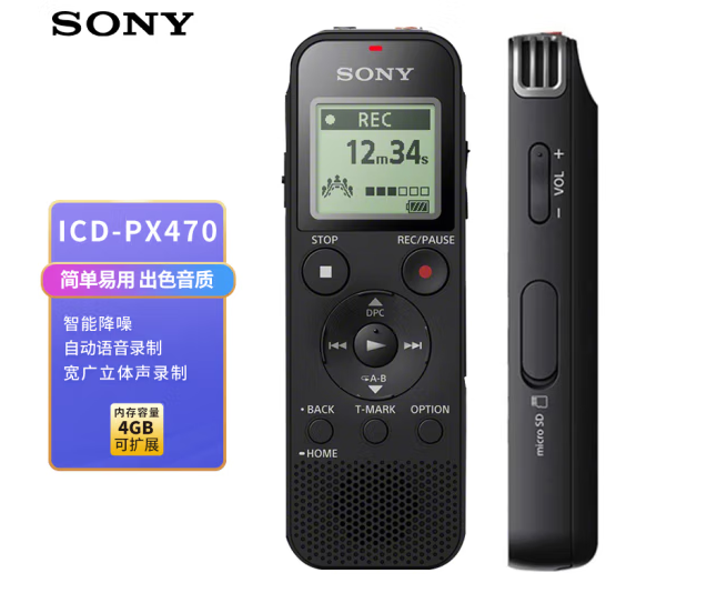 索尼(SONY)录音笔ICD-PX470 4GB 黑色 支持PCM线性录音 便携式学习商务采访 专业大直径扬声器SKU:SXT10114537